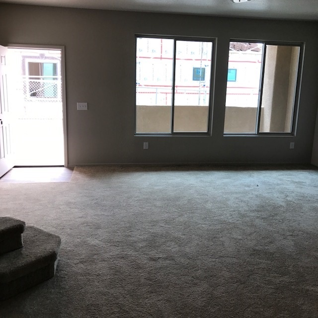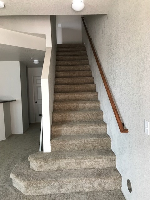 1464 sq. ft. , 2 stories. Downstairs: Living room, dining room, kitchen with stove, dishwasher, refrigerator, 2 car attached garage, 1/2 bath. Upstairs: Master bedroom with bathroom and sliding glass door to upstairs balcony, laundry room with washer/dryer, 2 other bedrooms and hall bathroom.