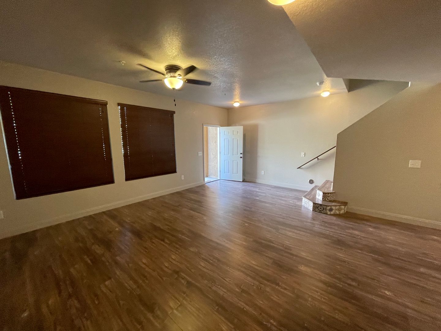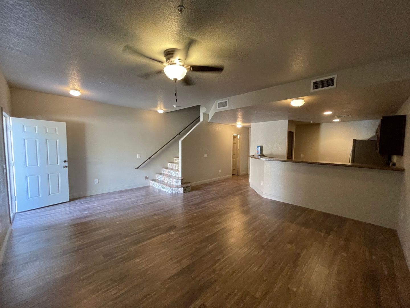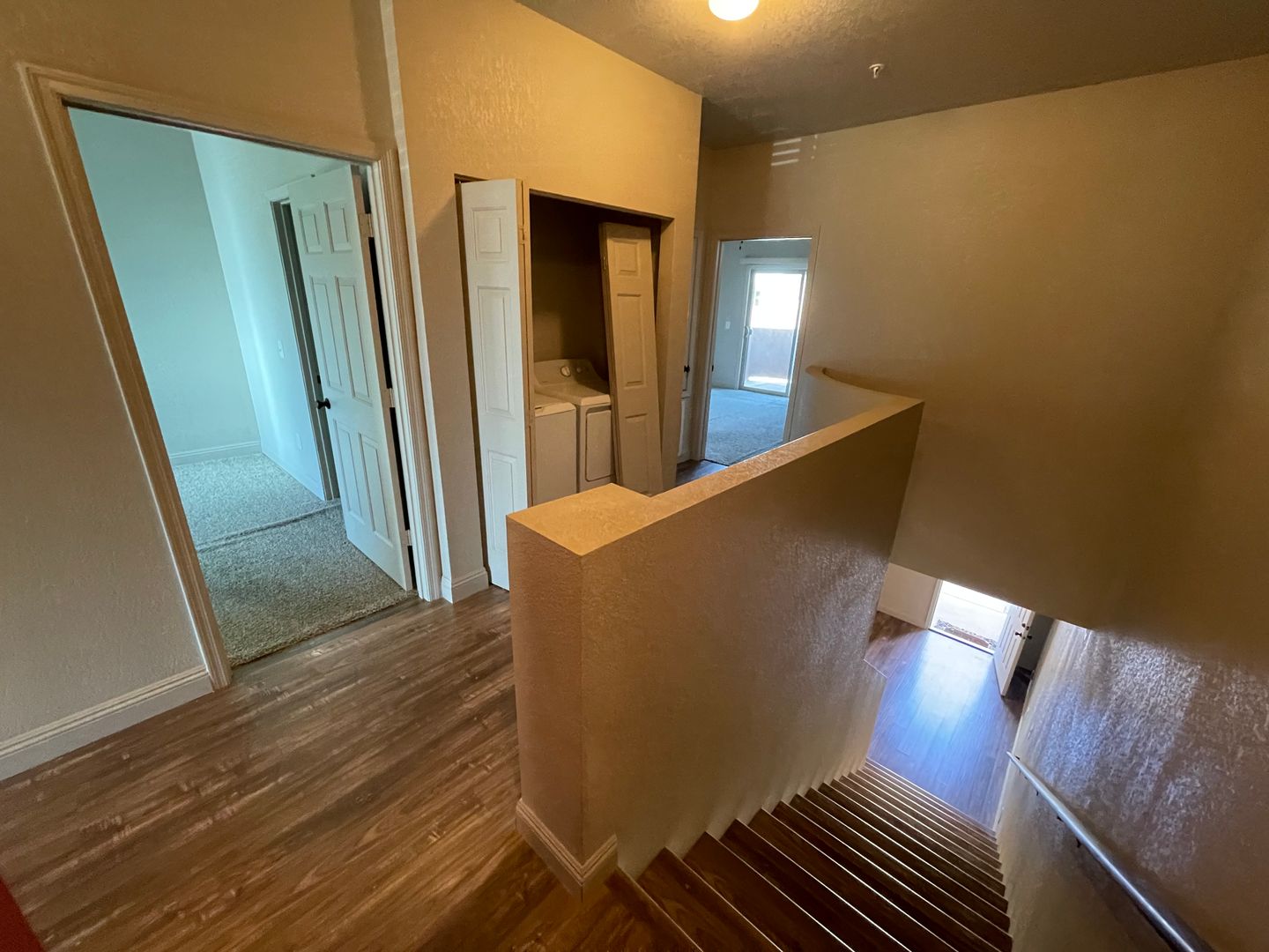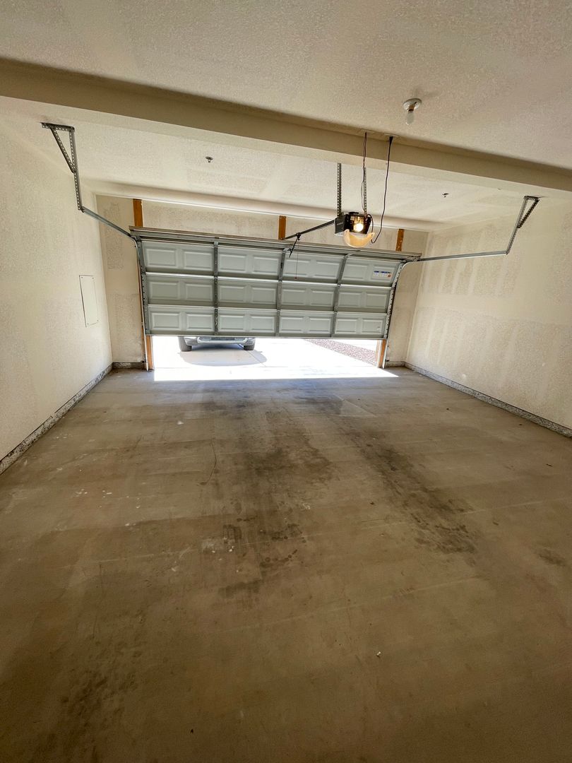 1464 sq. ft. , 2 stories. Downstairs: Living room, dining room, kitchen with stove, dishwasher, refrigerator, 2 car attached garage, 1/2 bath. Upstairs: Master bedroom with bathroom and sliding glass door to upstairs balcony, laundry room with washer/dryer, 2 other bedrooms and hall bathroom. Beautiful tile flooring.